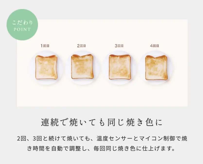 また発熱スピードが早く火力が強いことで単純にパンの焼き上がりが早くなるので、朝が忙しい人にもおすすめできます。