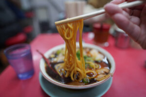 スープに麺を浸してずずっとすすると、スープと麺がちょうどいい塩梅で混ざり合います。
